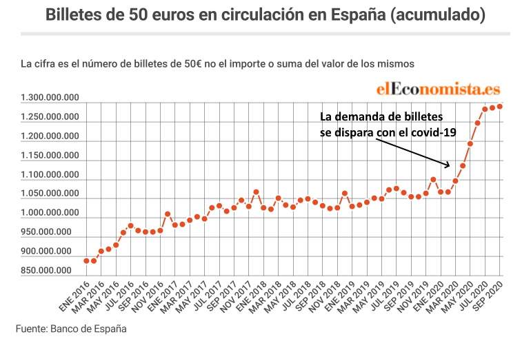 Resulta curioso ver las tendencias del número de billetes en circulación según su denominación. Todas se han mantenido relativamente estables (los de 500 porque el BCE los va retirando poco a poco), siendo el billete de 50 euros el que ha llevado el peso de este incremento en el importe (valor) de los billetes en circulación. En los últimos años, el número de billetes de 50 rondaba los 1.000 millones, pero tras el estallido del covid-19, la cantidad acumulada se ha disparado hasta casi los 1.300 millones de billetes de esta denominación. Los billetes son la forma de dinero que eligen mayoritariamente las familias para cuando usan el efectivo como depósito de valor (ahorrar en monedas es complejo por motivos logísticos).